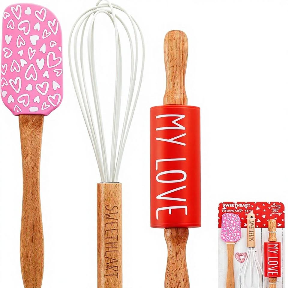 Juego de Repostería Mini para San Valentín Fuutreo, Espátula, Batidor, Rodillo, Resistente al Calor, Diseño de Corazones, para Hornear, Cocinar, Servir y Mezclar