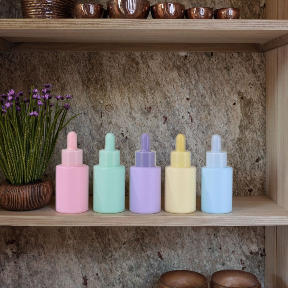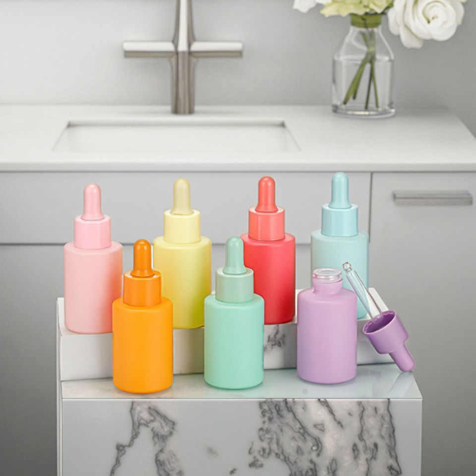 Fuyun, botella de suero de vidrio personalizada de 30ml, botellas cuentagotas de aceite esencial de color rosa, azul y púrpura, tapón de rosca para el cuidado de la piel, pelucas, Máscara