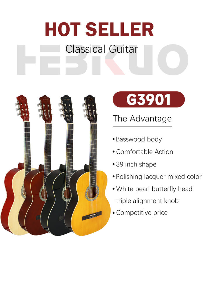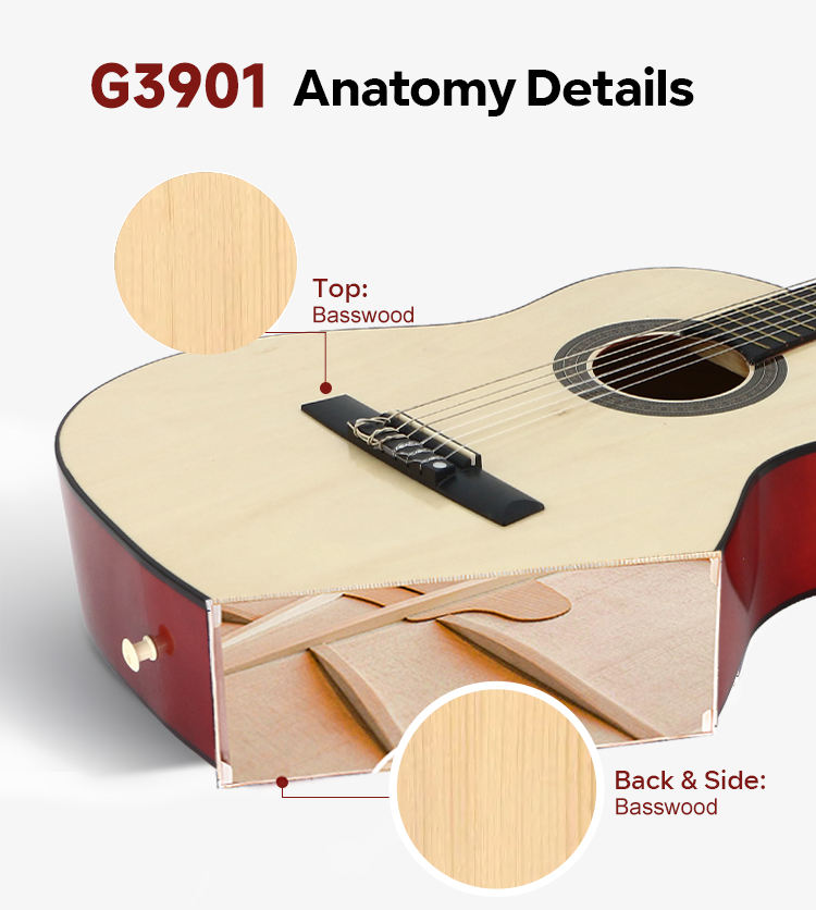 Guitarra Clásica G3901 Directo de Fábrica, Guitarra Acústica de 39 Pulgadas con Cutaway de Corcho, Guitarra Clásica de 6 Cuerdas para Principiantes
