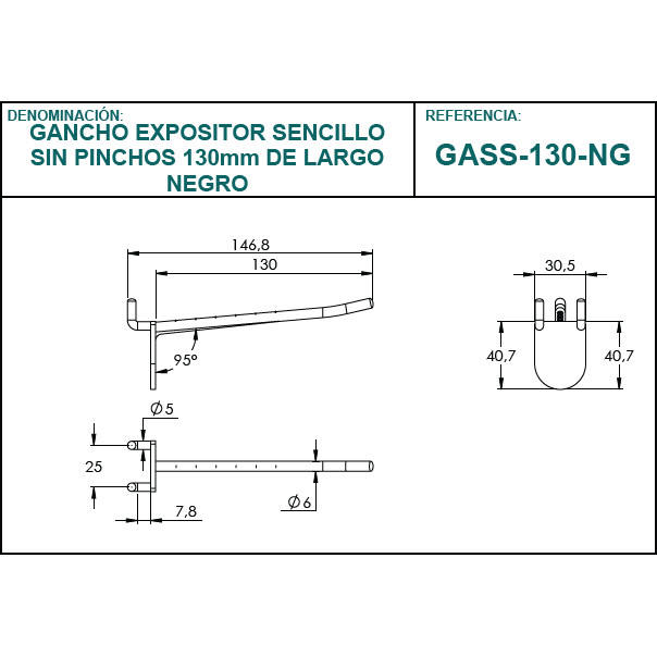 Gancho de pantalla individual de 130mm, negro, sin puntas