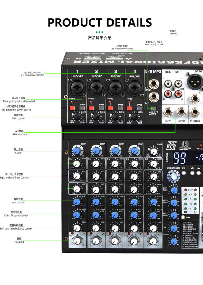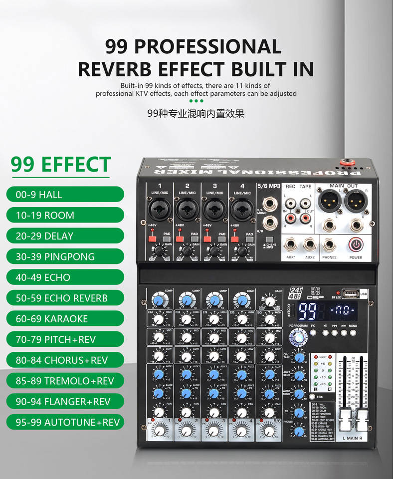 Consola de Mezclas GAX-SN6 de 6 Canales Reverberación Profesional para Escenario Mini Mezclador USB