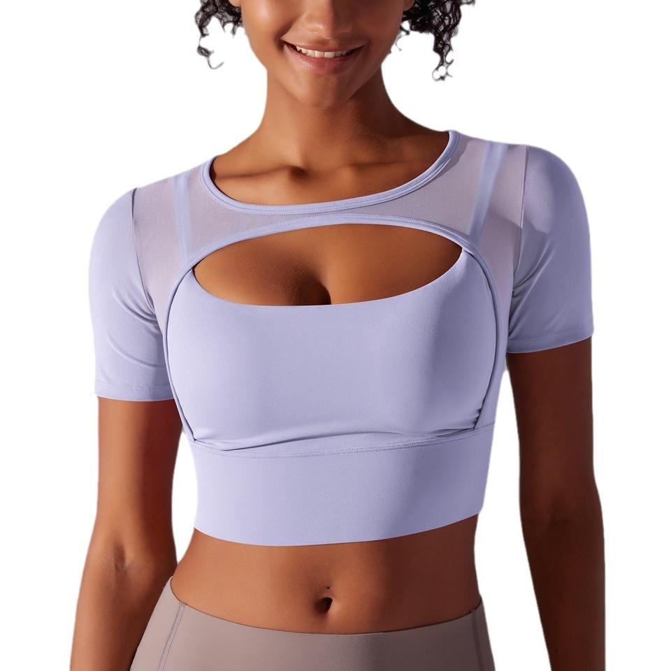 GC Color puro costura Sexy doble capa de manga corta tirantes sujetadores reunidos correr Fitness Yoga ropa chica