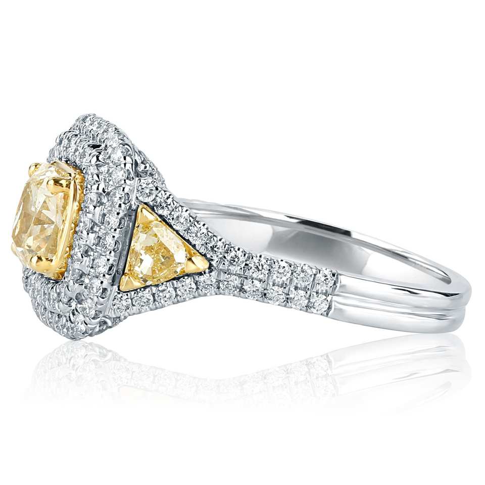 Anillo de diamante de corte radiante amarillo de 1,90 quilates certificado GIA, diamantes laterales de corte trillón amarillo, compromiso de doble halo de oro blanco de 18K