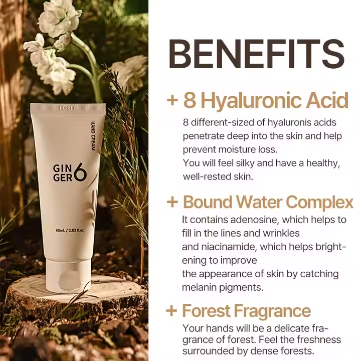 GINGER6 Crema de manos nutritiva Perfume Infundido Vegano Jengibre Agua y ácido hialurónico Hidratante para una piel suave e hidratada
