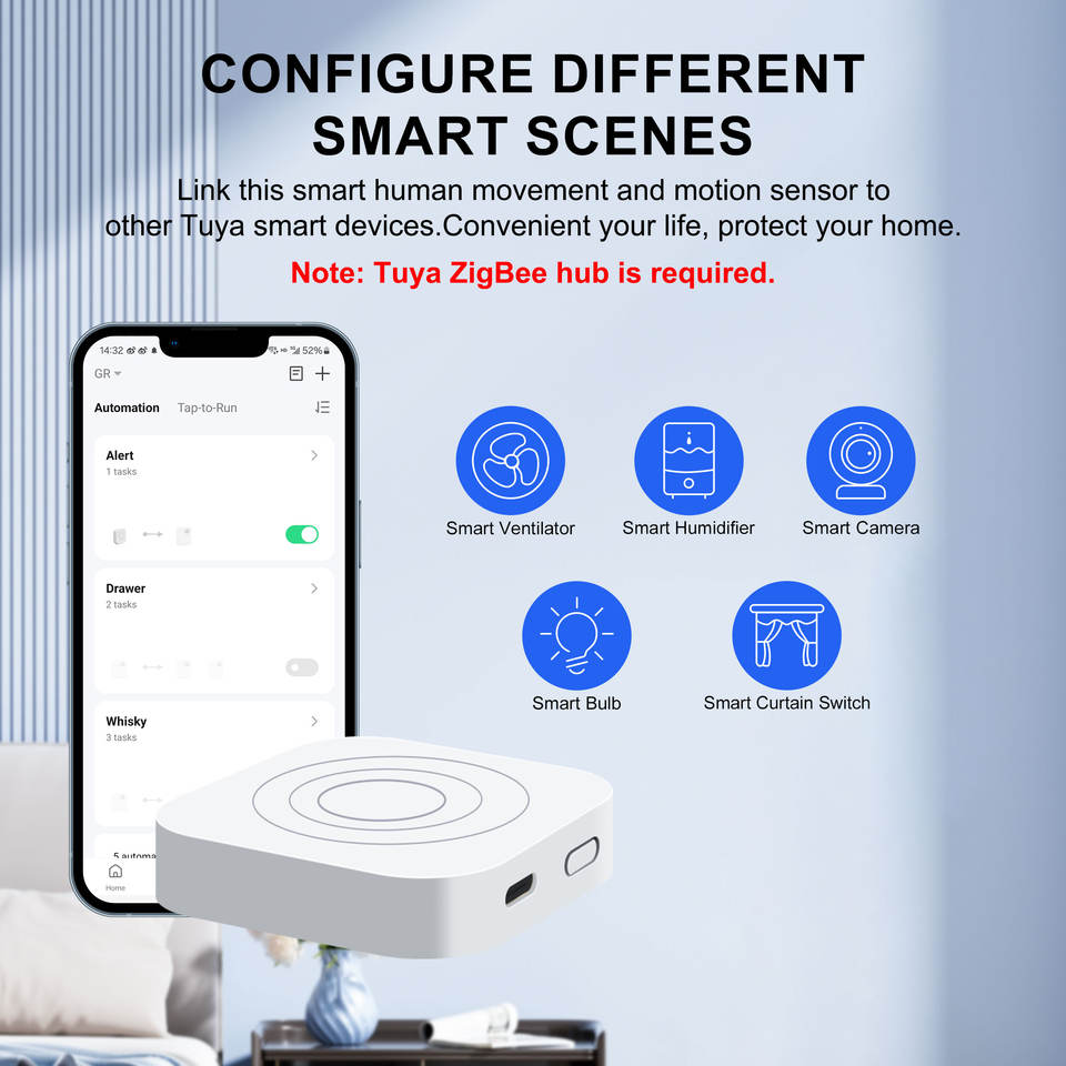 GIRIER Smart Home Tuya ZigBee Sensor de presencia humana Detector de movimiento humano inteligente 24GHz MmWave Detección de radar