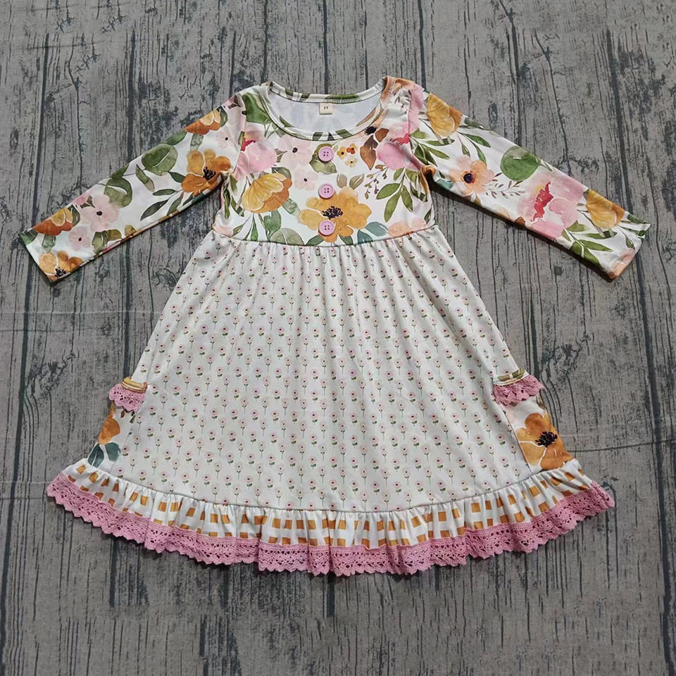 GLD1588 RTS Vestido de verano transpirable hasta la rodilla para niña, con flores pequeñas naranjas y manga larga, conjunto para hermanas