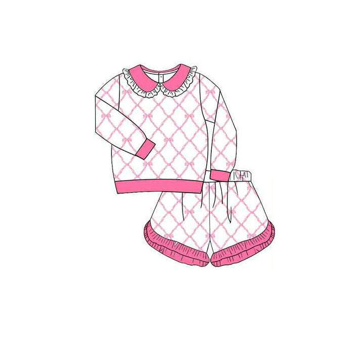 GLS0037 RTS Little Girl Pink bows Blue Flowers Print trajes de verano niños al por mayor de manga larga Niña conjunto de ropa infantil