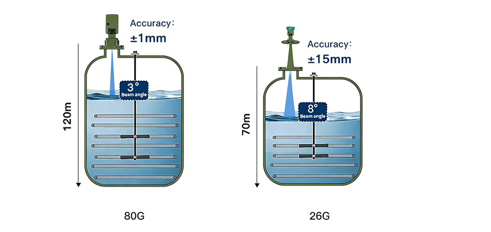 Rango de medición:0,08 m ~ 30 m (líquidos); 0,3 m ~ 60 m; 0,6 m ~ 120 m