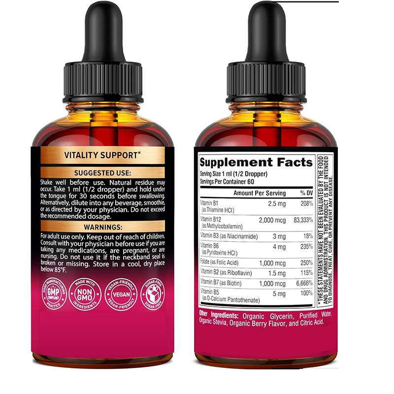 Suplemento Dietético de Vitaminas del Complejo B 8 en 1, 20000mcg, con Sabor a Bayas Naturales, Fórmula Personalizada con Logotipo, Certificado GMP, Gotas Líquidas Orgánicas