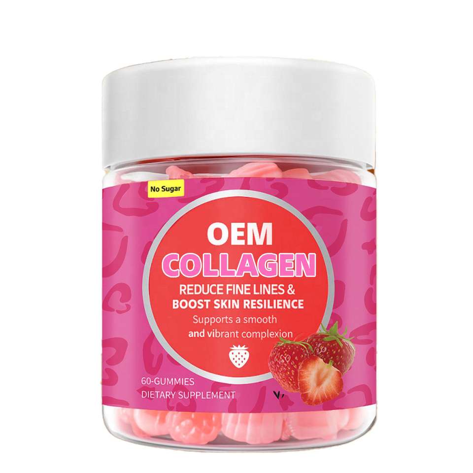 Gomitas de colágeno OEM sin azúcar 60 unidades. Reducen las líneas finas y mejoran la resistencia de la piel. Favorecen una tez suave y radiante.