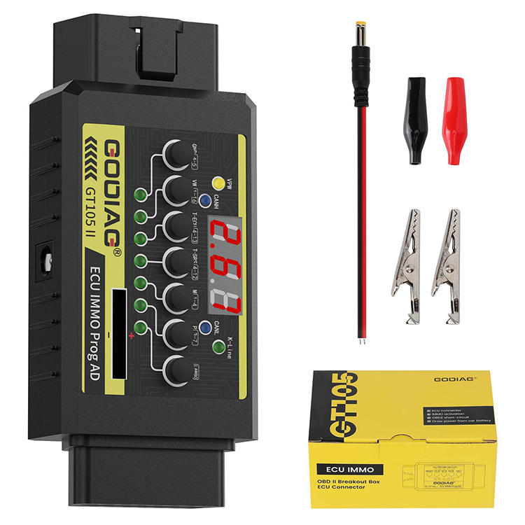 Lector de Códigos de Auto OBD2 GODIAG GT105 II, IMMO Prog AD con Caja de Conexión, Muestra el Voltaje del Vehículo y de la Batería, Alarma de Bajo Voltaje de 12V