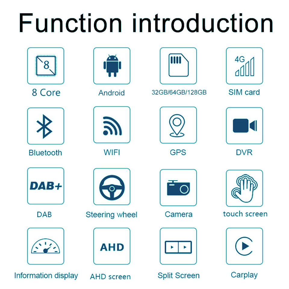 GPS, Estéreo, MANOS LIBRES, TPMS, RGB, Control remoto, Amplificador, OBD2, DSP, CarPlay, Enlace espejo, Android auto, Imagen en la imagen, Micrófono incorporado, Pantalla dividida, Administrador de archivos, Par de torsión, Coche de Control de volante