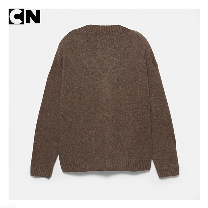 Suéter con Certificación GRS, Fabricación Personalizada con Logotipo, Suéter Cárdigan Básico de Algodón y Lana con Cuello en V, Color Marrón, con Puños y Dobladillo Acanalados
