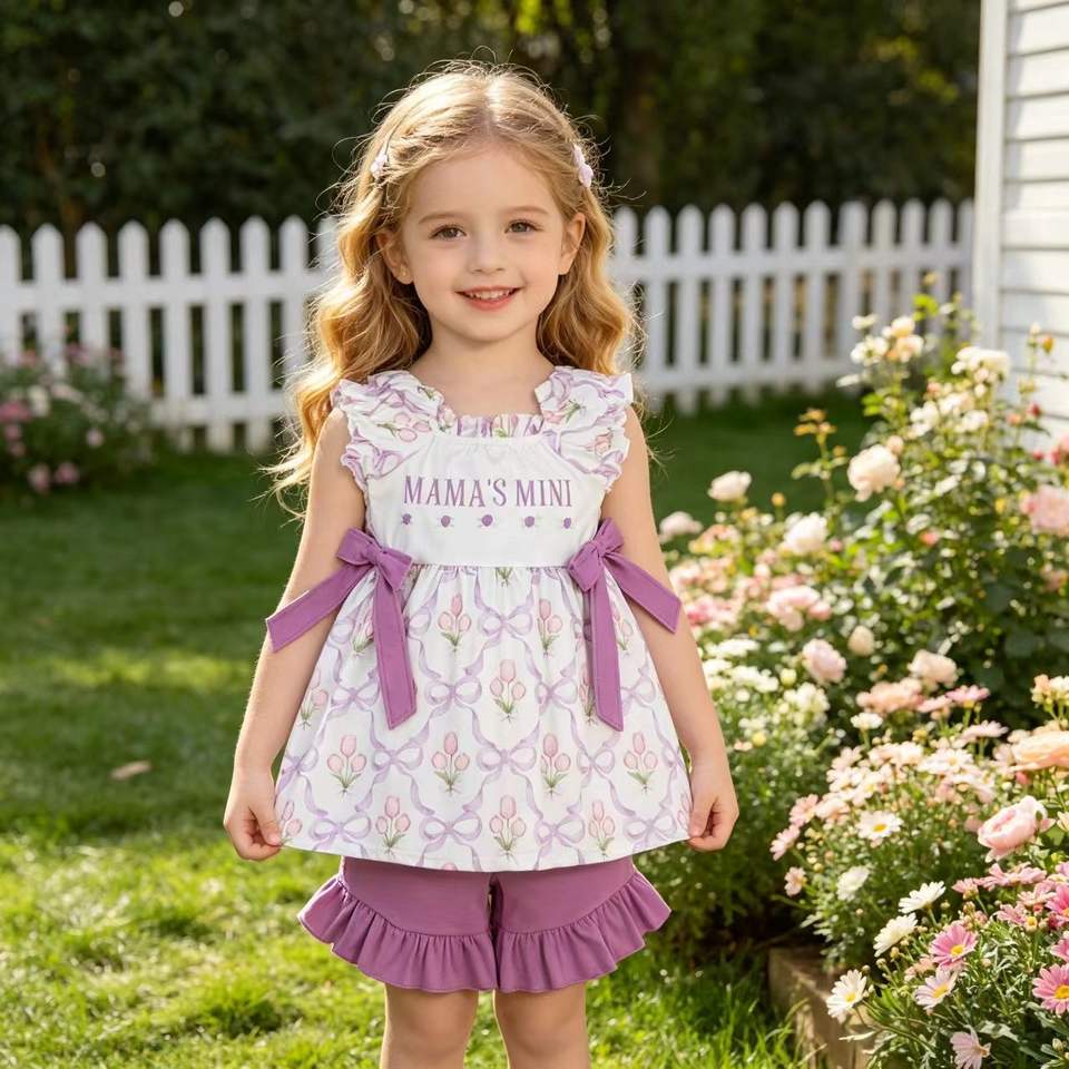GSSO2489 RTS Little active girl Purple flowers bows MAMA'S MINI print summer outfits kids wholesale girl child shorts sleeve set