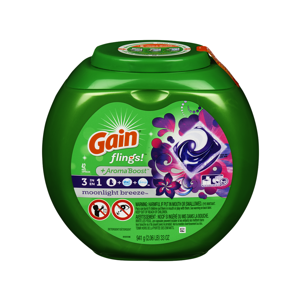 Detergente para Ropa Gain Flings, Paquete de 76, 3 en 1, con Oxi Boost y Fragancia Febreeze Moonlight Breeze, Origen Estadounidense, 80% de Ingredientes Activos