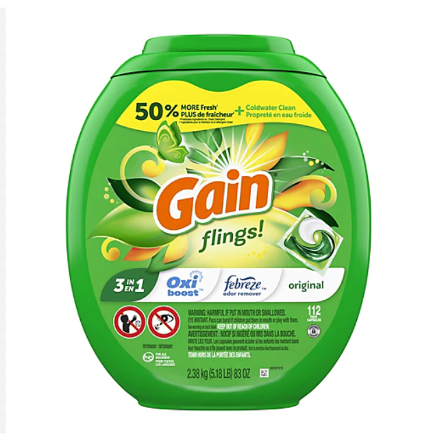 Paquetes de detergente para ropa Gain Flings con Oxi Boost y Febreze, Moonlight Breeze Scent, 60 unidades
