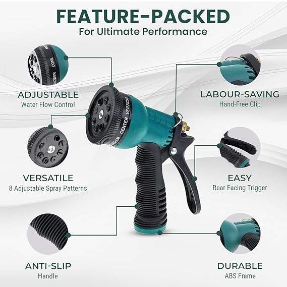 Manguera de jardín con pistola de pulverización de 8 patrones, 3 abrazaderas y adaptador para grifo, manguera de agua verde de alta resistencia para jardín y lavado de coches.