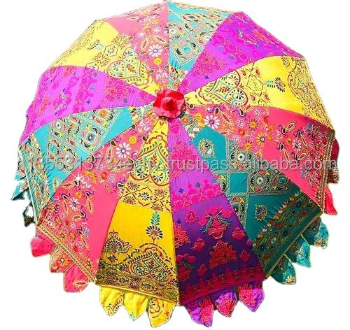 Sombrilla de Jardín Bohemia Rajastaní para Exteriores, Diseño Único de Bordado Artesanal con Marco Metálico de Loro para Uso Decorativo
