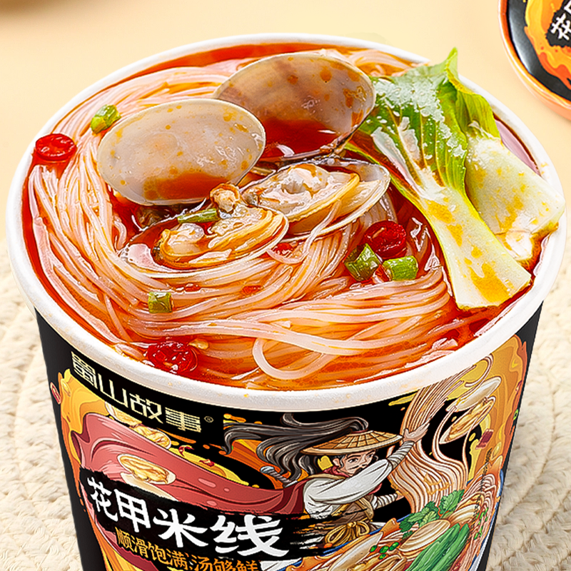 Fideos de arroz con ajo y almejas, fideos de arroz, Cubo de cerveza instantánea en taza, embalaje de fideos instantáneos, fideos finos