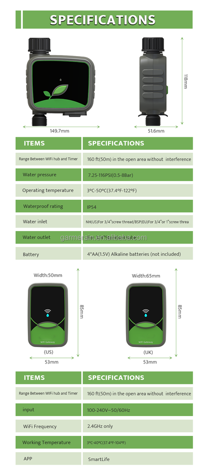 Temporizador de Riego Automático Inteligente WiFi Garmerain GWT201R-2, Programable, con 2 Pilas AA, Presión de 0.5-8 Bar para Jardín