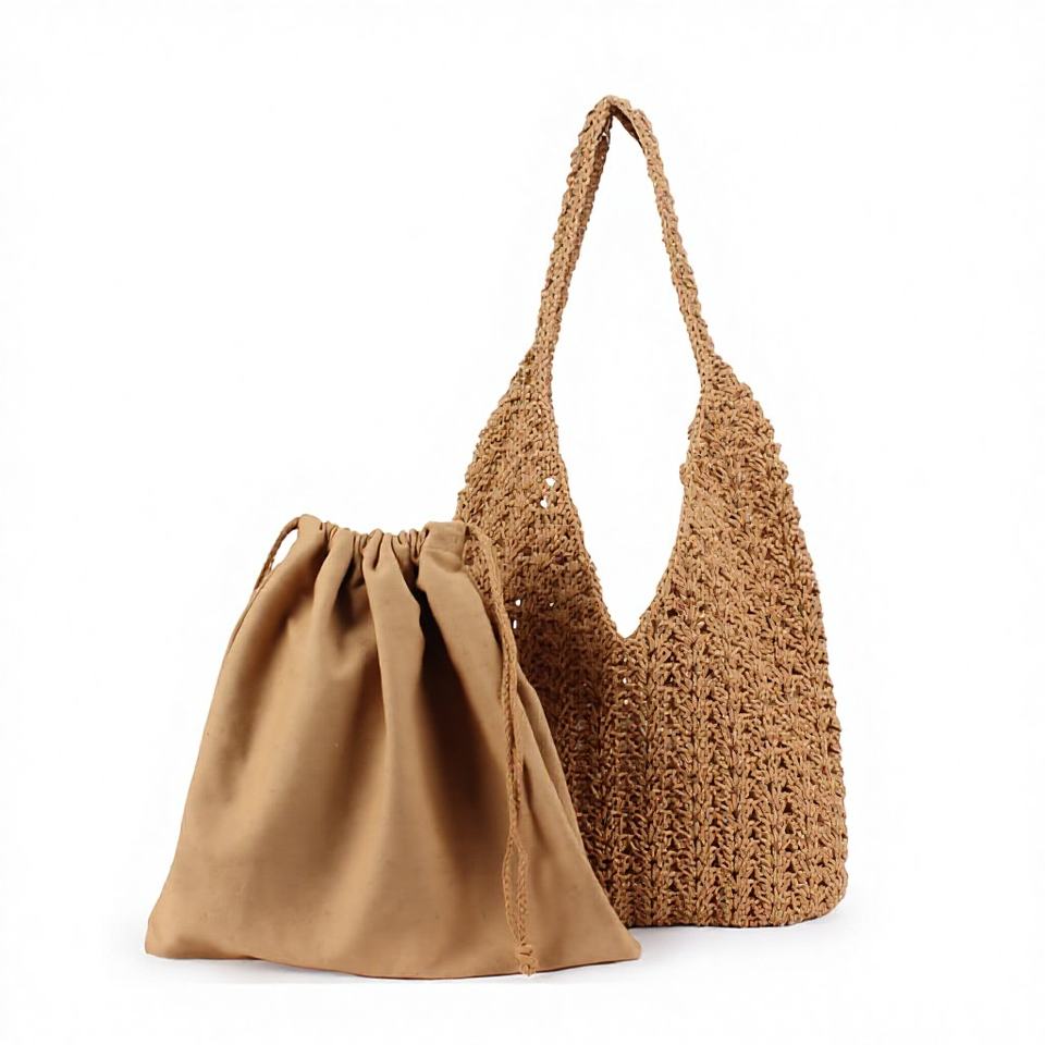 Bolso Tejido Simple de Cuerda de Algodón, Tamaño Mediano, para Otoño, Vacaciones en la Playa, Ocio, Color Bronceado