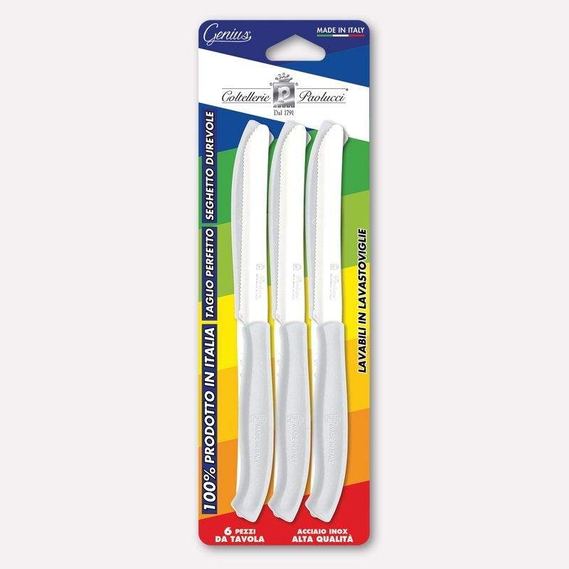 Juego de cuchillos de mesa Genius, 6 piezas, mango blanco, hoja de acero inoxidable serrada de 11 cm, hecho en Italia