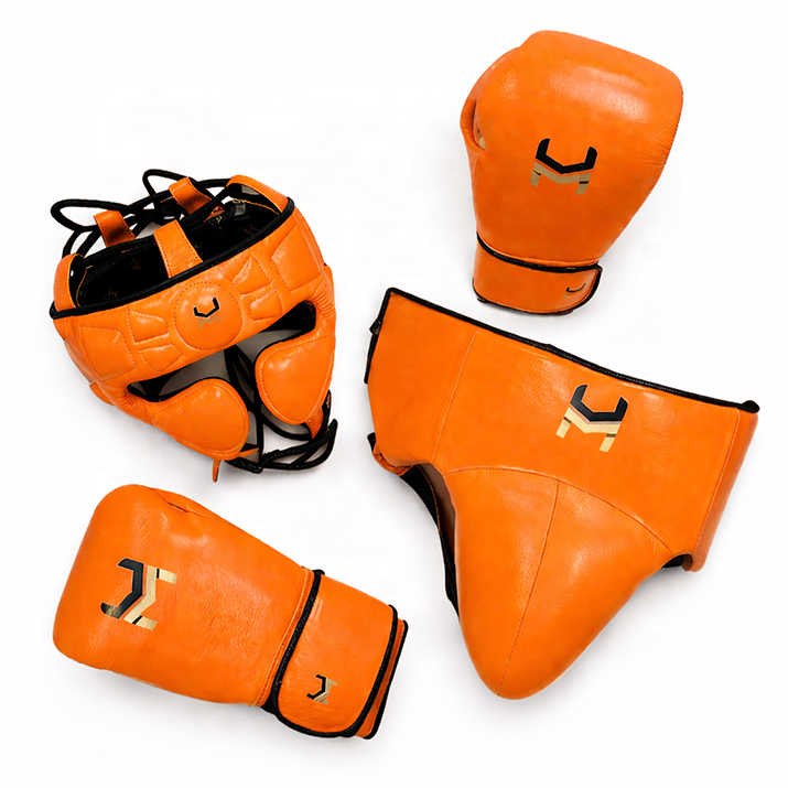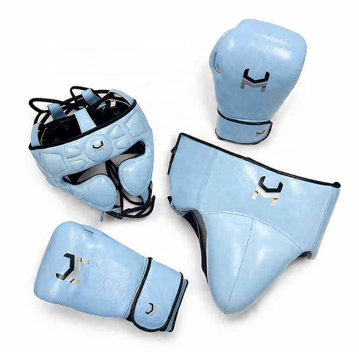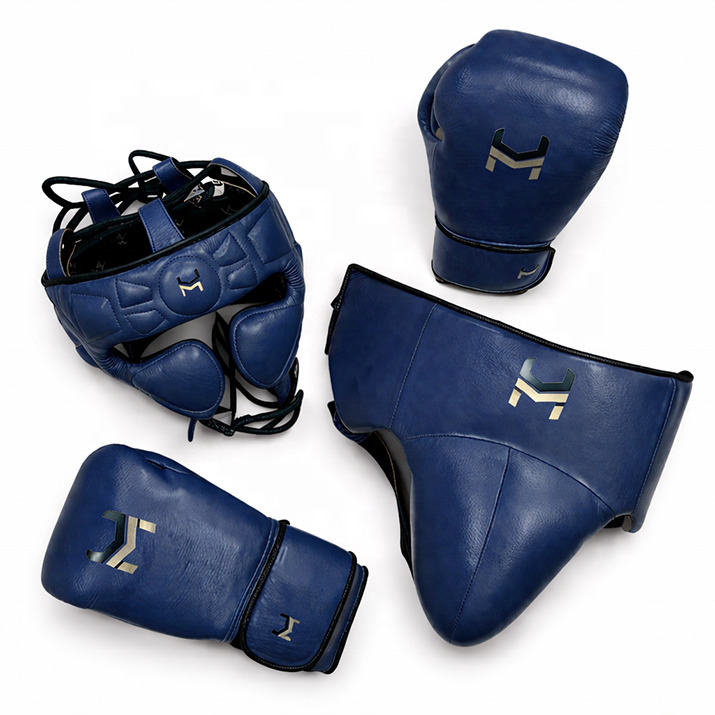Set de Boxeo Profesional Personalizado de Cuero Genuino de Vaca Hit N Move Azul para Sparring, Guantes con Cordones, Protección para Cabeza e Ingle, Venta al por Mayor
