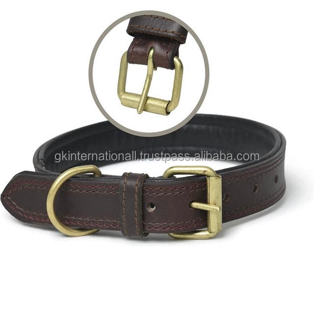 Collar de piel auténtica para perro, colgante de cuero marrón con hebilla de metal antigua, anillo en D, relleno completo, doble costura, en todos los tamaños