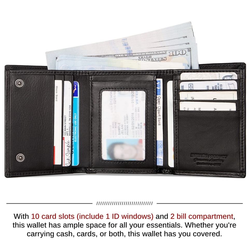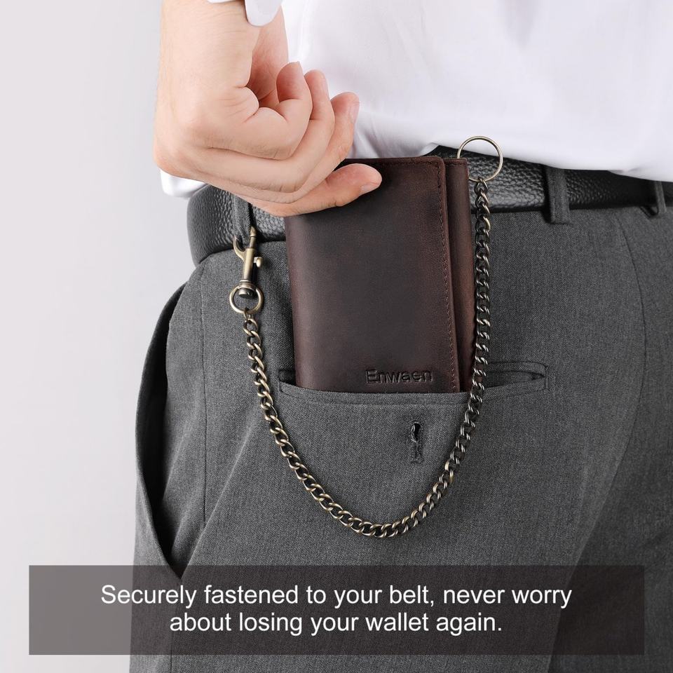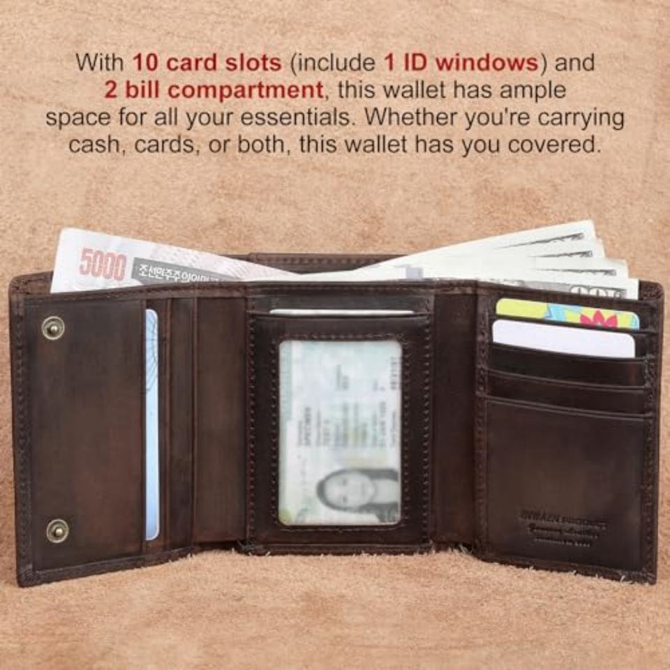 Genuine Leather Wallet with RFID Feature Luxury Retro Double Key Pocket Card Holder Anti-Theft Short Trifold Chain Purse