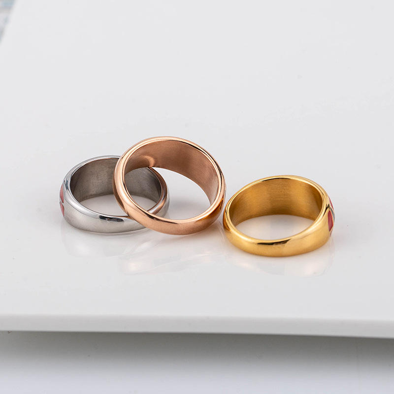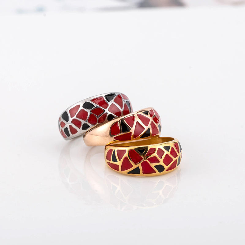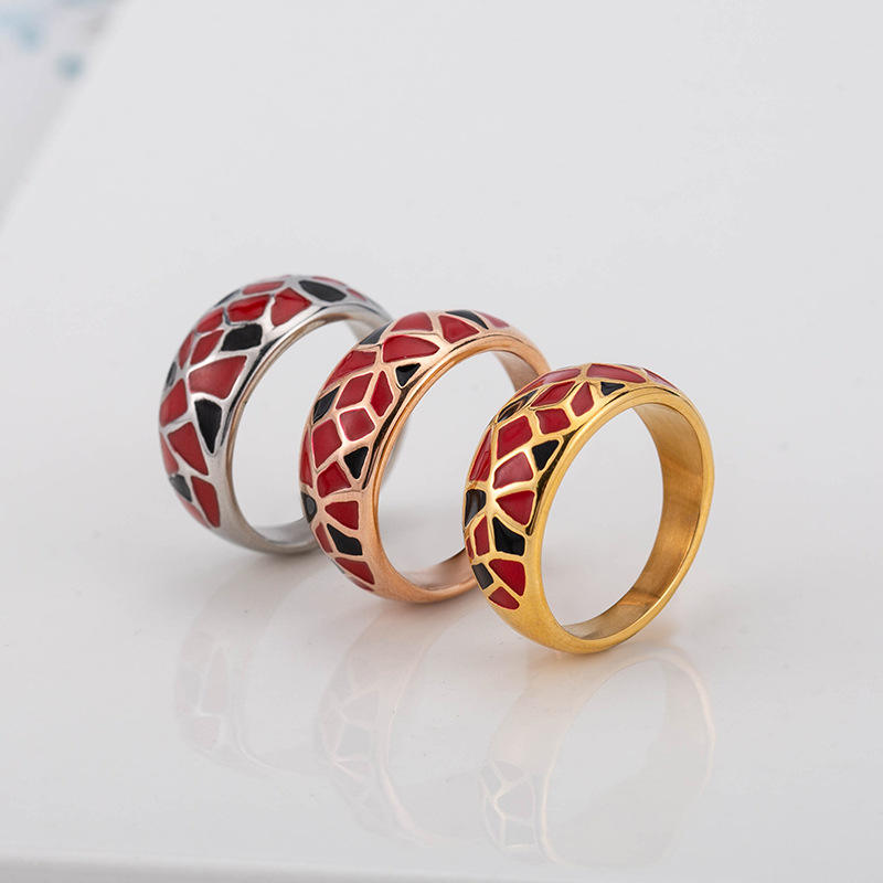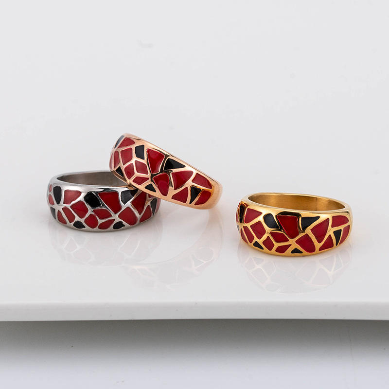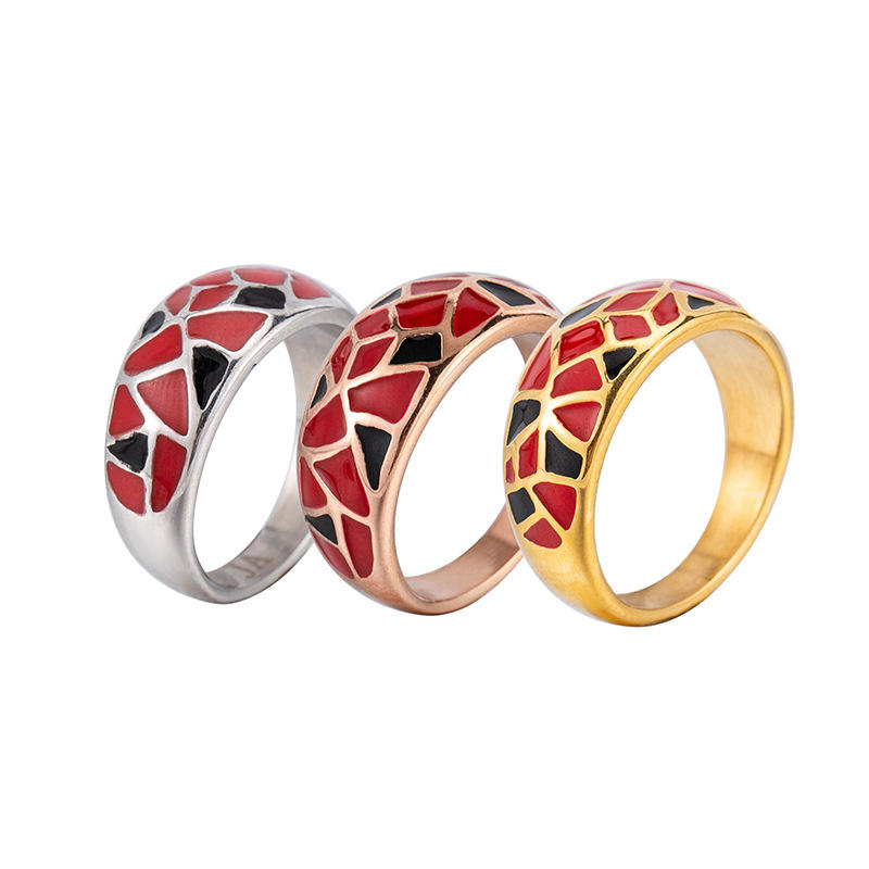 Anillos geométricos esmaltados de acero de titanio, joyería de moda unisex, regalo con patrón rojo y negro XYR0035