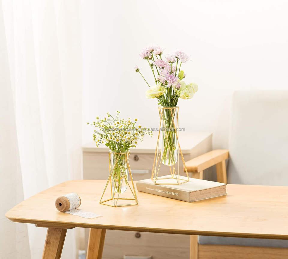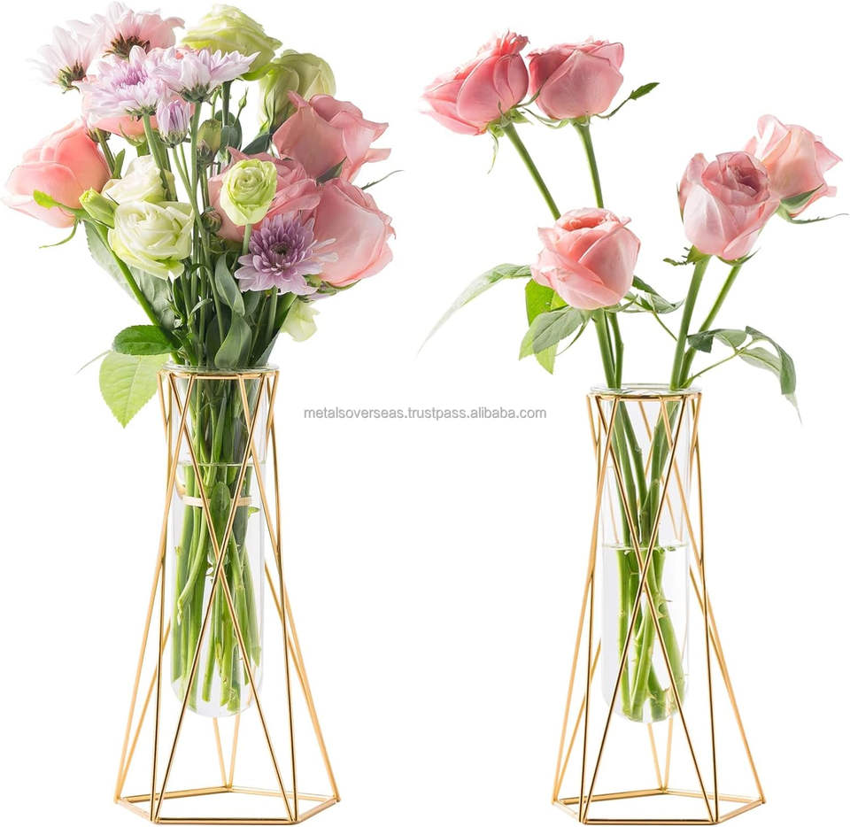 Jarrones geométricos de alambre con insertos de vidrio para centro de mesa Jarrones de metal dorado para arreglos florales minimalistas