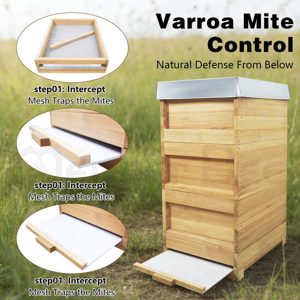 1 tapa grande, 3 cajas de colmena y 1 fondo de cajón de malla de alambre.