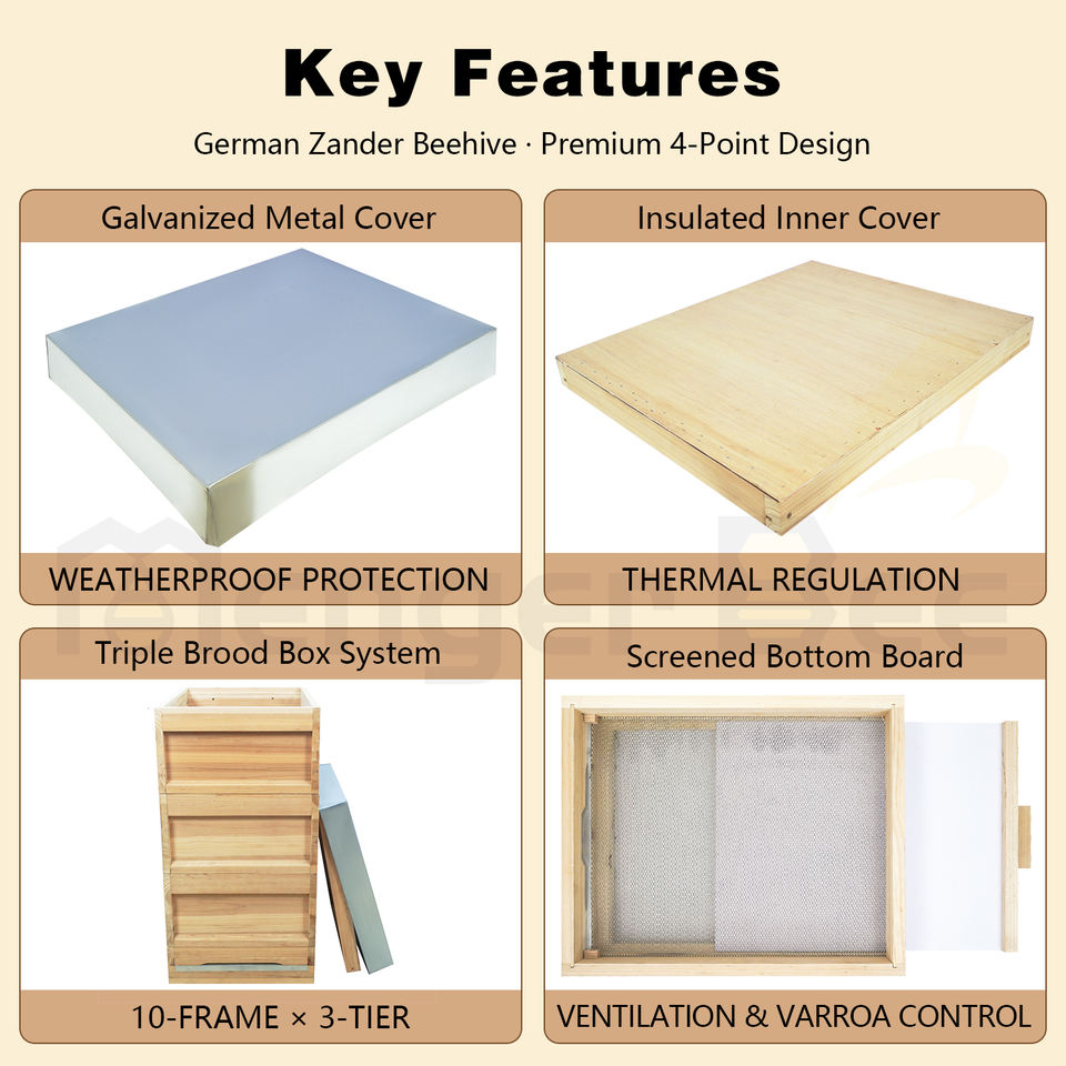 Componentes terminados:1 tapa grande, 3 cajas de colmena y 1 fondo de cajón de malla de alambre.