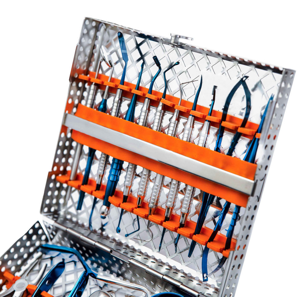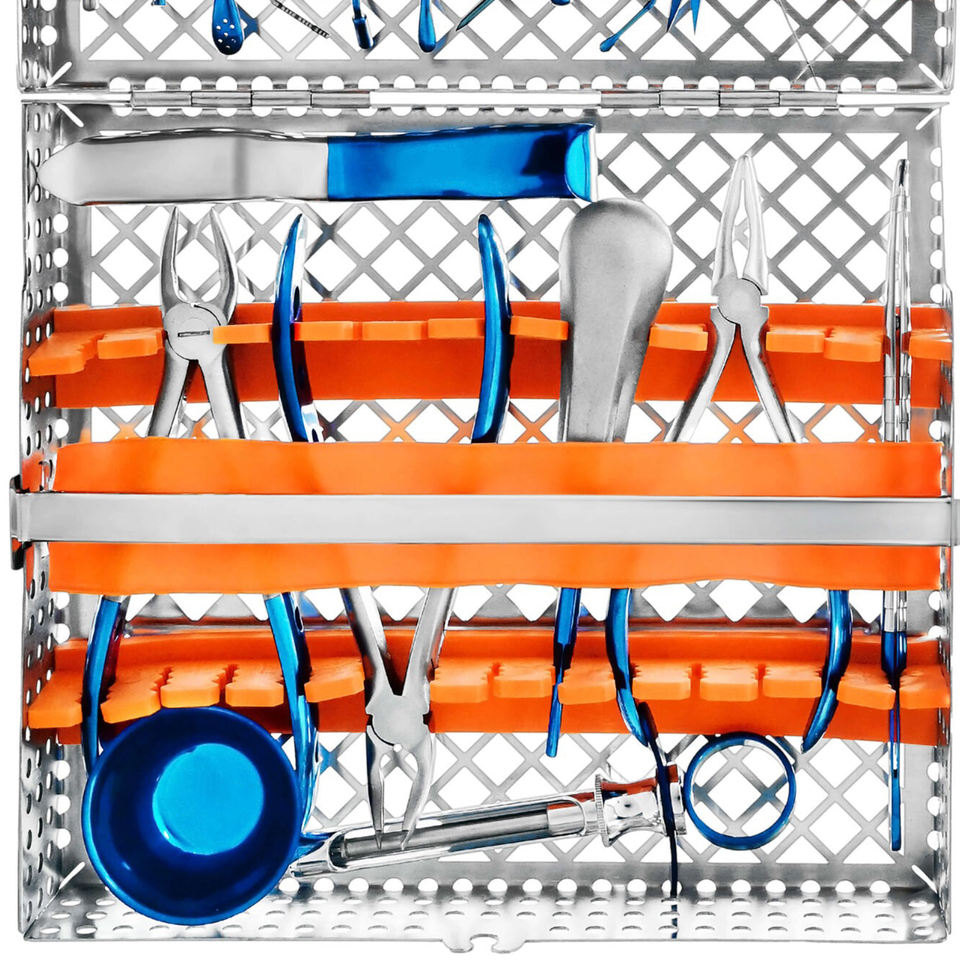 Juego de 19 Instrumentos Dentales Azul/Plateado, Kit de Herramientas, Alicates, Bandeja de Esterilización, Empuñadura Ergonómica, Acero Inoxidable Alemán