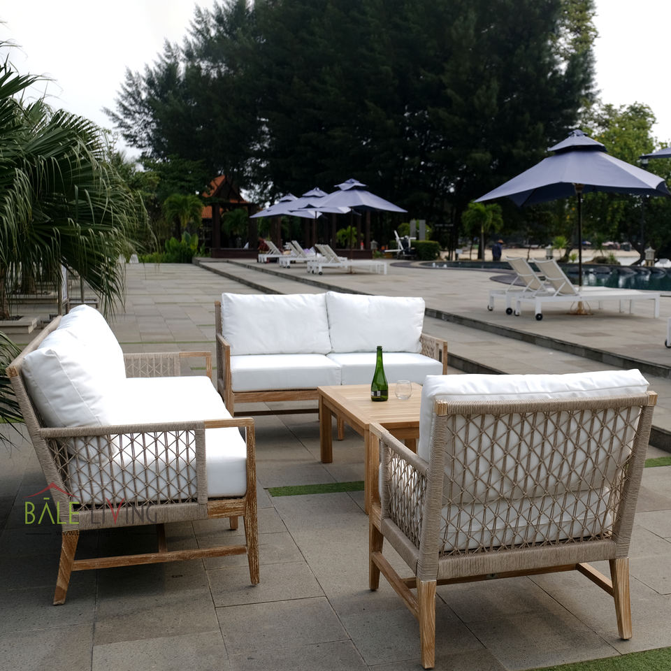 Sofá con presupuesto de Suecia, silla de amor de teca maciza, asiento profundo, sofá de jardín, cojines laterales tejidos con cuerda, sofás de jardín incluidos para Villa
