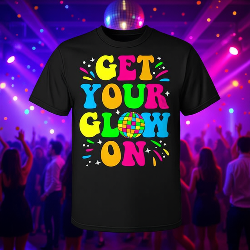 Camiseta a juego para fiesta Get Your Glow On, diseño multicolor negro
