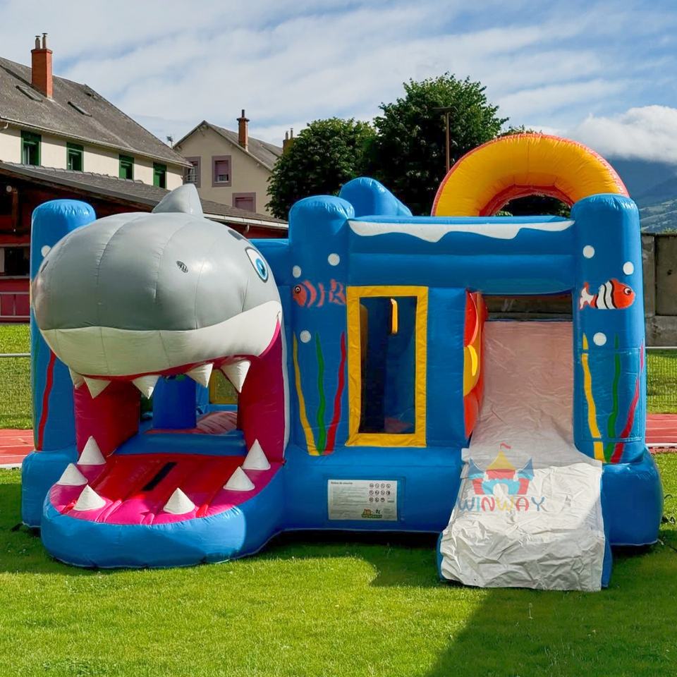 Casa de rebote inflable con temática de tiburón gigante tobogán marca Winway Material de PVC 500kg capacidad para fiestas de cumpleaños divertidas en el patio trasero
