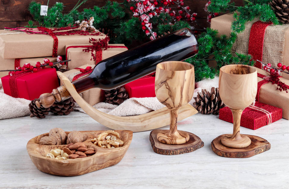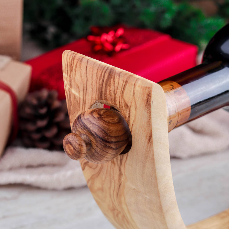 ArtisRaw Juego de regalo hecho a mano de 2 Copas de teca y portabotellas-Artesanías en madera de primera calidad para decoración navideña