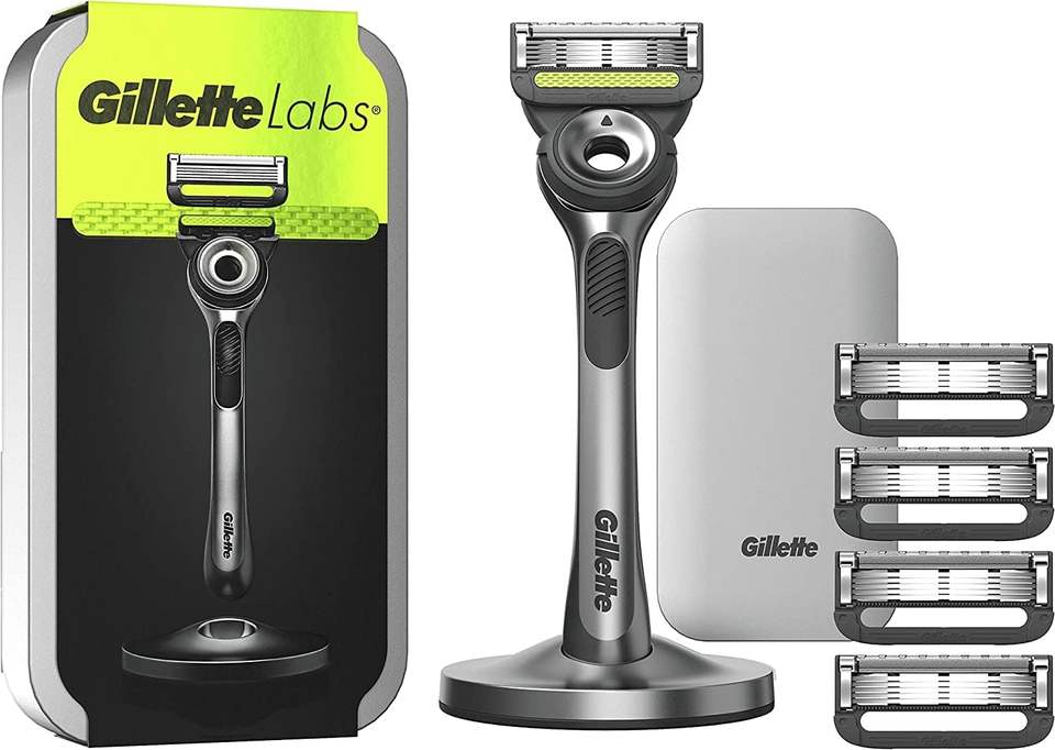 Gillette Labs-Maquinilla de afeitar con barra exfoliante, 1 mango + 5 hojas de afeitar, incluye bolsa de viaje y soporte magnético Premium