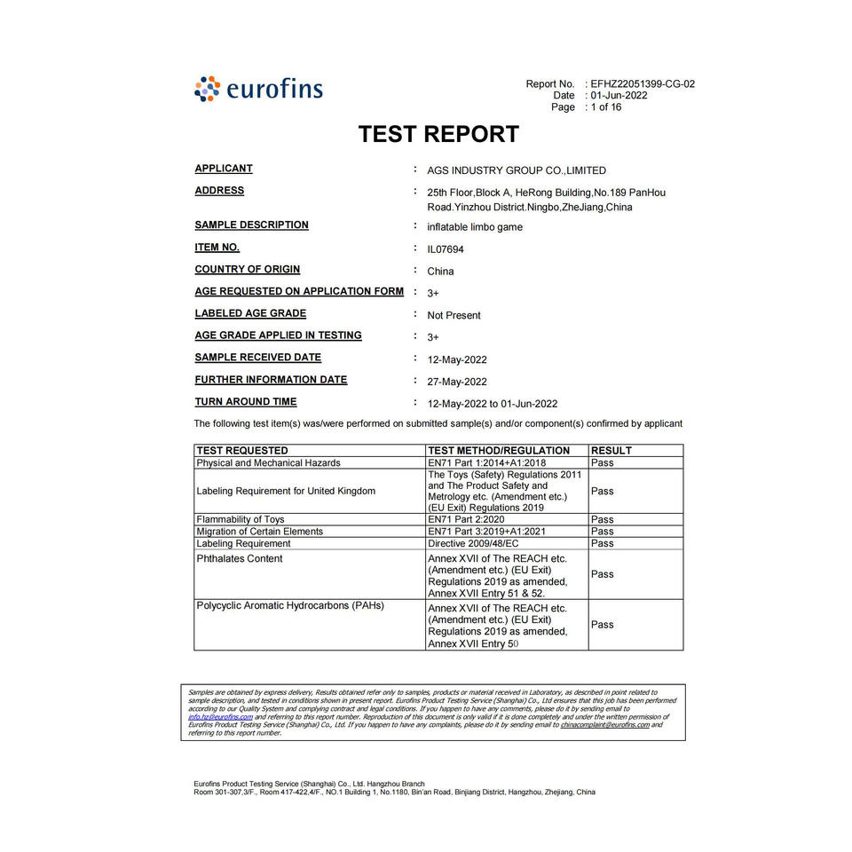 Certificados:EN71-2-3, Informe de pruebas