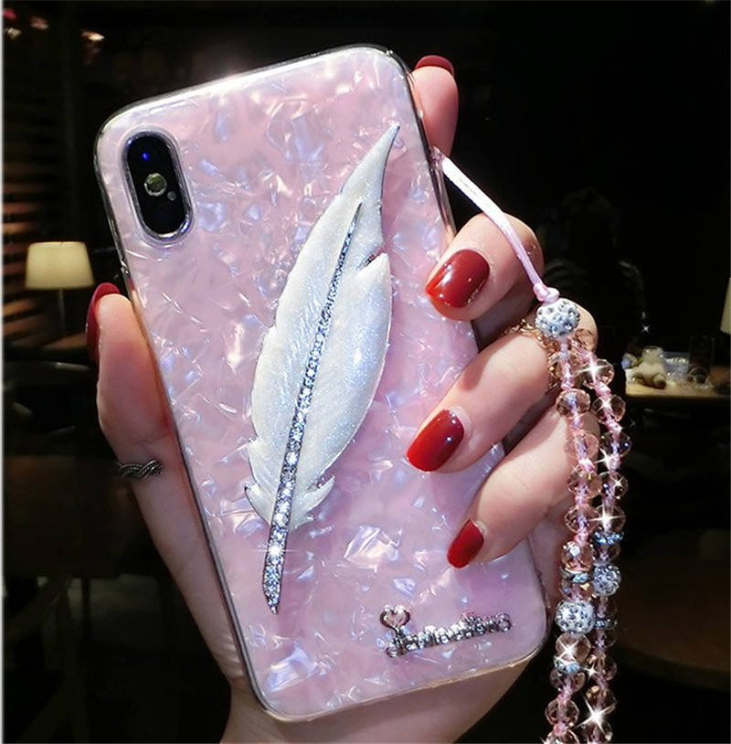 Funda de teléfono con purpurina de plumas con cuerda para niñas y mujeres para iPhone 11 Pro X XS Max, para iPhone 12
