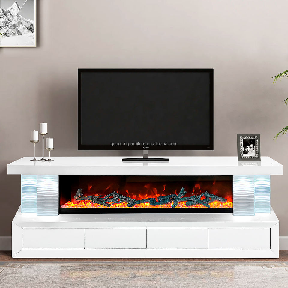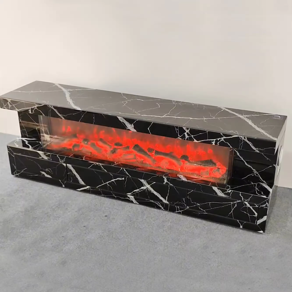 Mueble para TV con Efecto Mármol, Textura de Mármol, Espejo, con 4 Cajones, Chimenea Eléctrica Decorativa, Muebles
