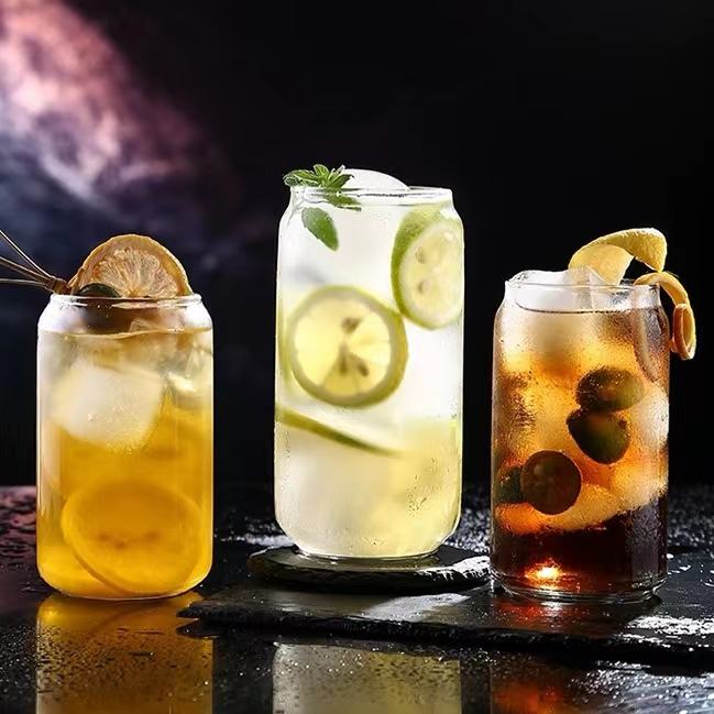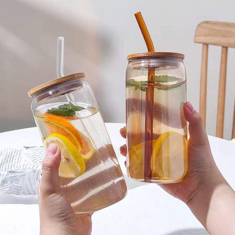 Tazas de vidrio con tapas de bambú y pajitas de vidrio Vasos para beber de 16 oz Tazas cawa de vidrio en forma de lata, ventosa de vidrio para café helado