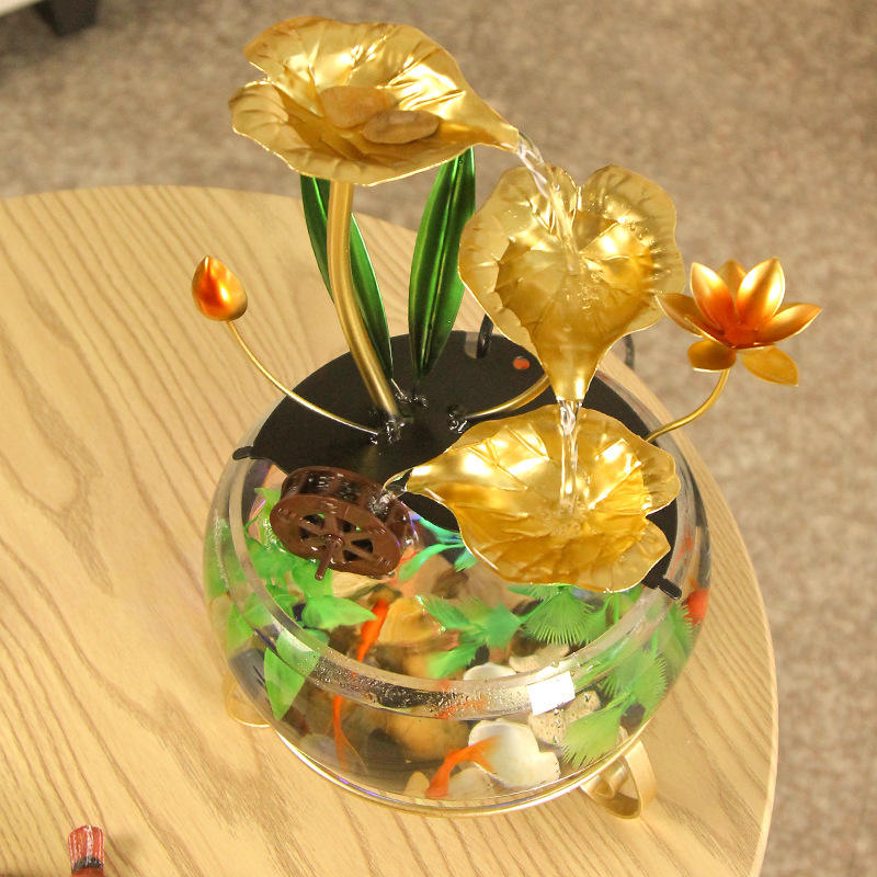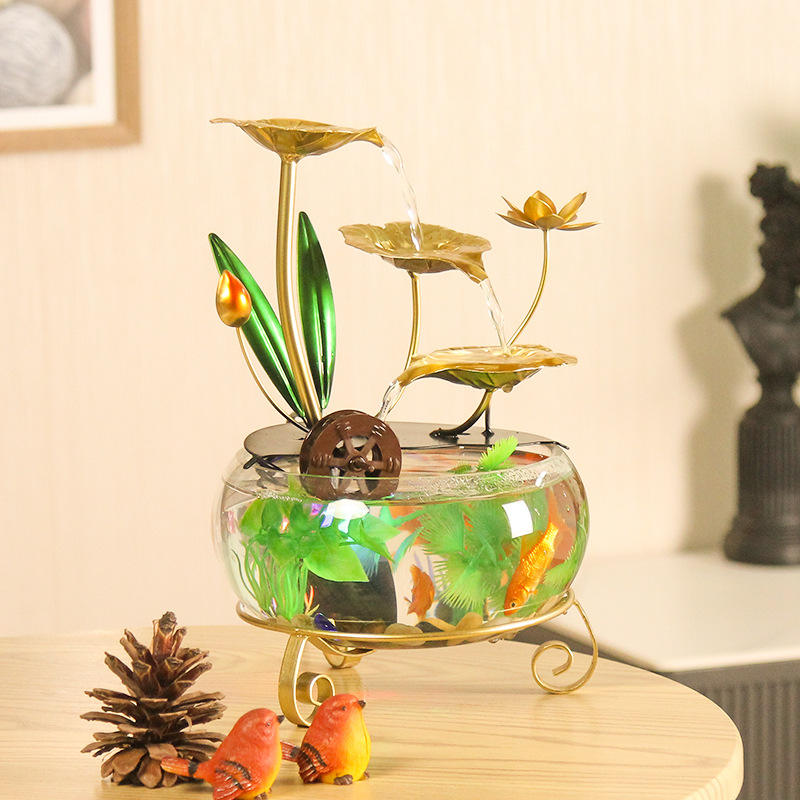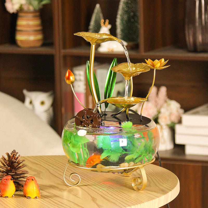 Pecera de cristal con fuente de agua circular, diseño minimalista para decoración de sala de estar y oficina.