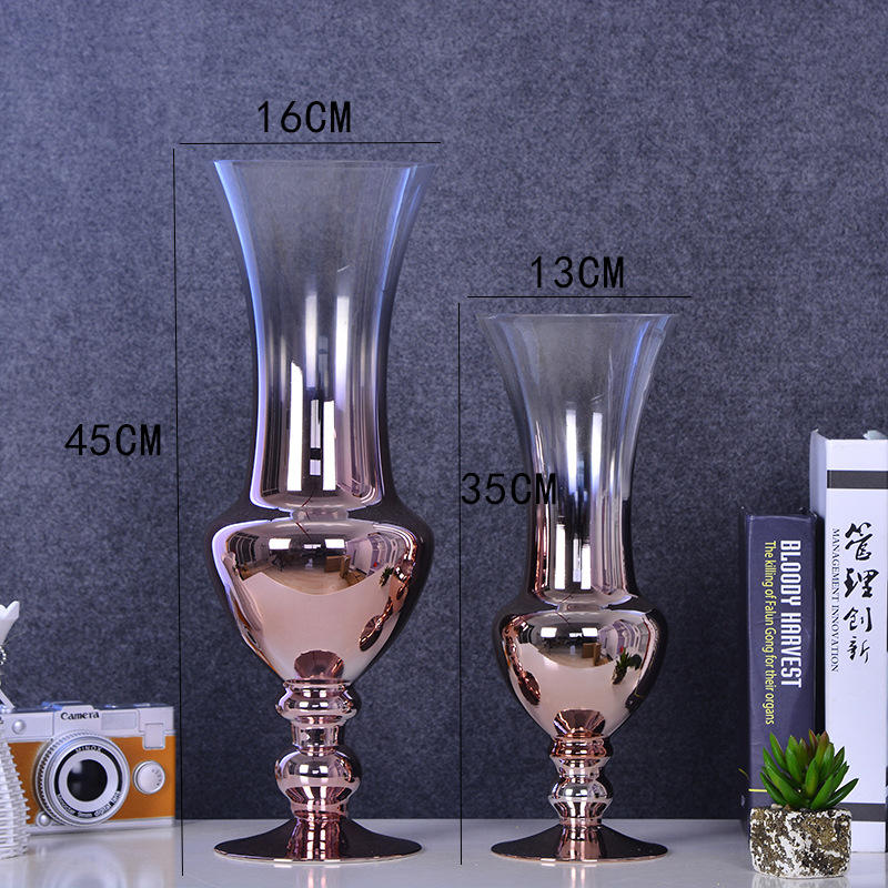 Florero de vidrio con gradiente alto, rampa, trompeta, arreglo transparente, soporte de flores de oro rosa para decoración de la sala de estar del hogar