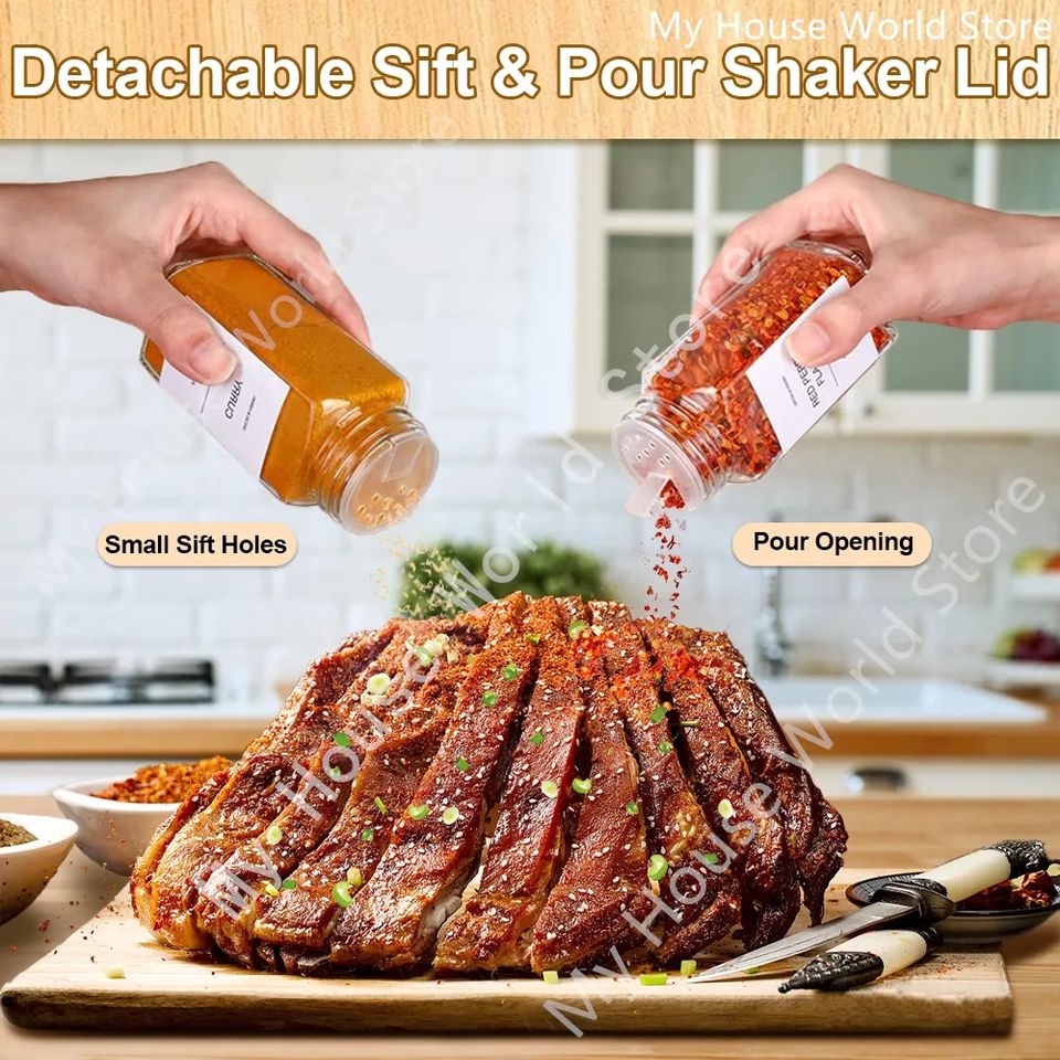 Juego de frascos de especias de vidrio, botellas con etiquetas de especias, 4oz, contenedores de especias cuadrados vacíos, olla para condimentos, tapas para coctelera de barbacoa y tapa de bambú-
