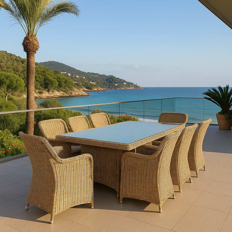 Mesa de comedor de ratán con tapa de cristal con sillas a juego para patio exterior, balcón y espacios de cafetería