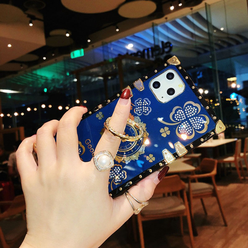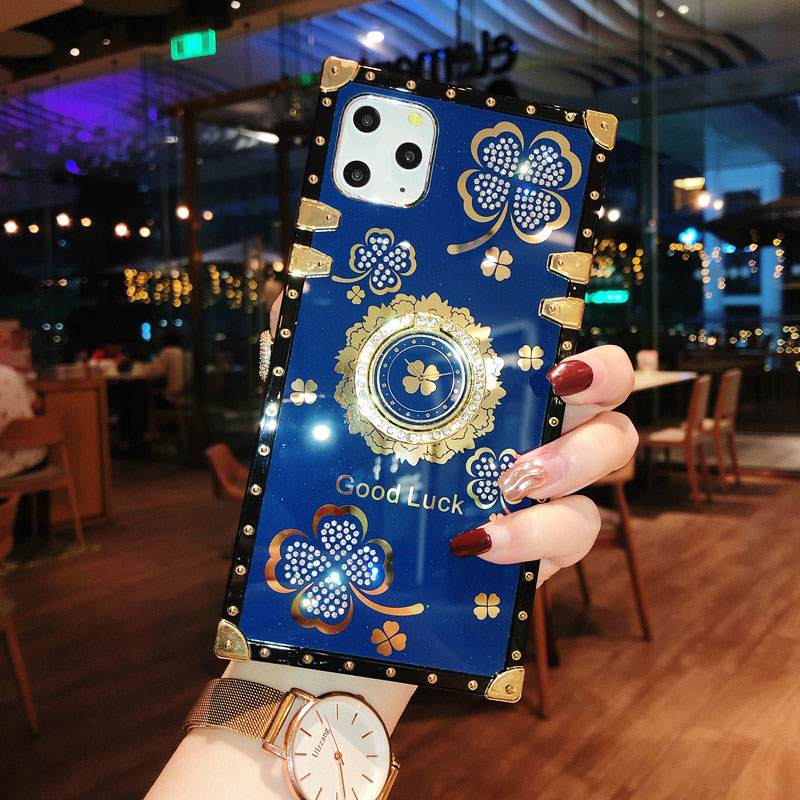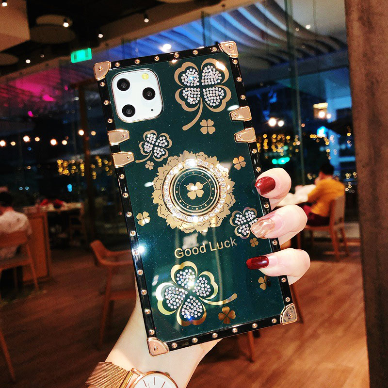 Funda de trébol de hoja de la suerte con diamantes de imitación brillantes para iPhone 16 Pro Max 15 14 13 12 11 XR XS X 8 7 6 Plus Funda con soporte de anillo