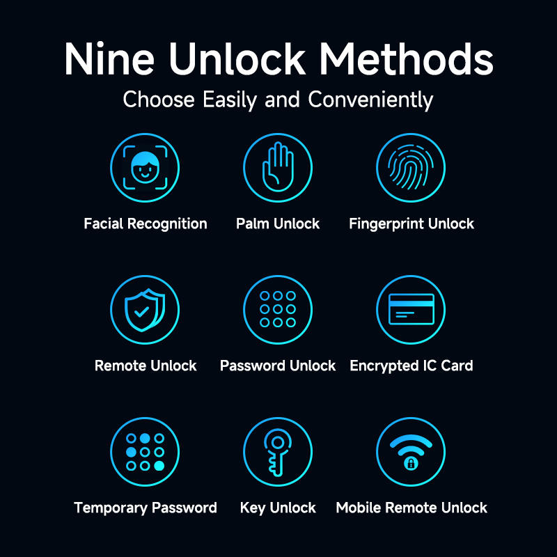 Unlock way:Face+Fingerprint +Tuya APP+ Password + Card + Key+Palm