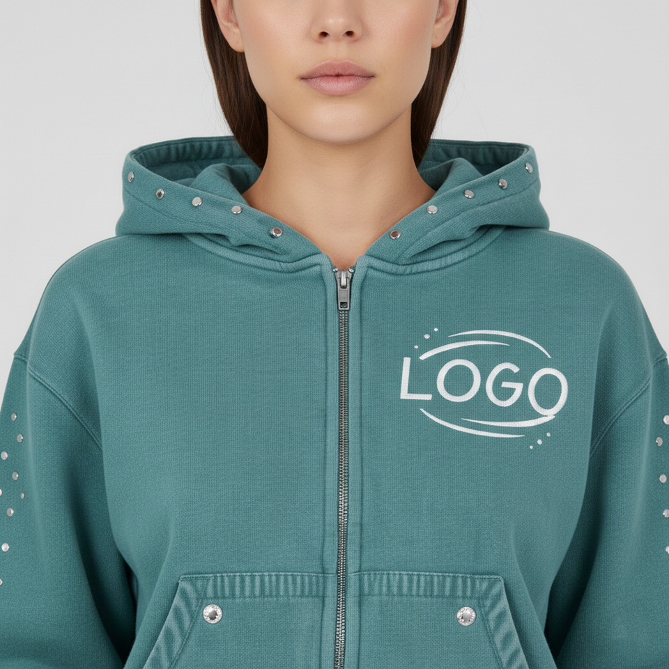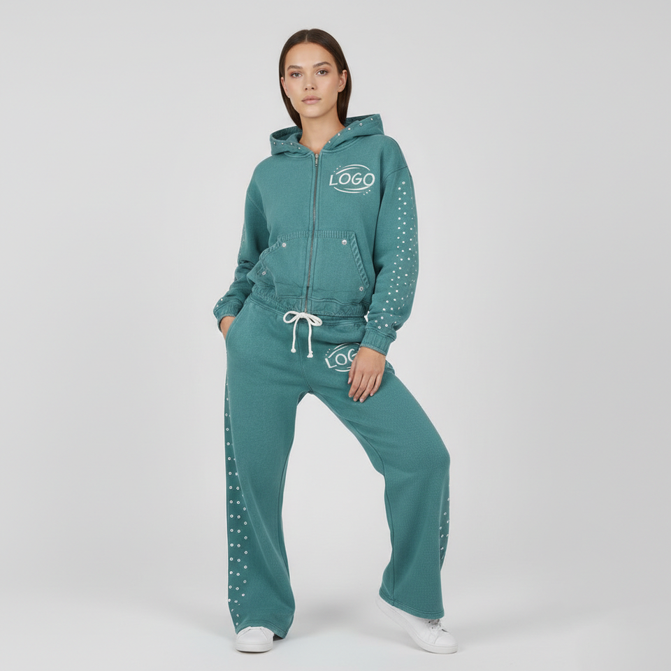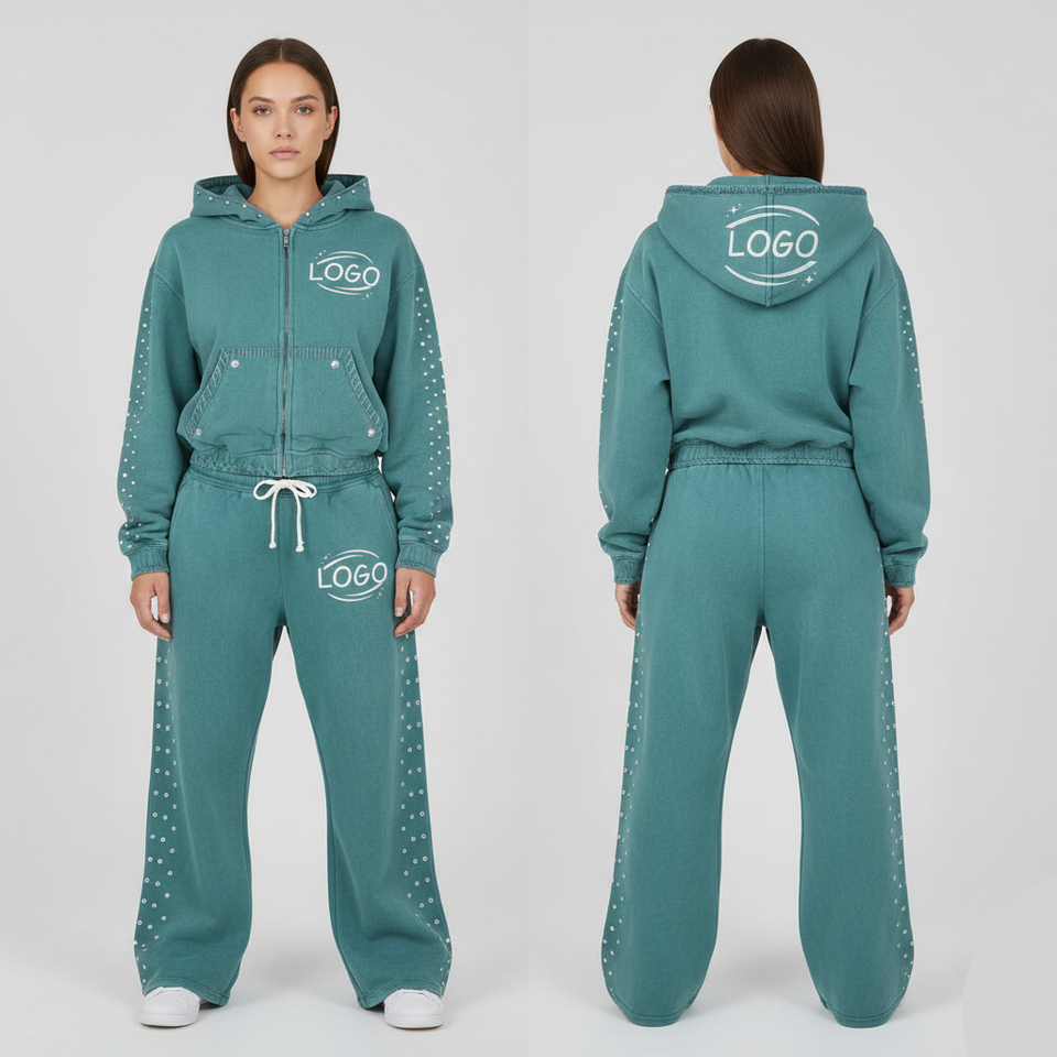 Conjunto de Sudadera con Capucha Corta y Pantalones Deportivos para Hombre, Estilo Streetwear, con Doble Cremallera, Lavado Ácido y Pedrería, de Peso Pesado, Marca Glory